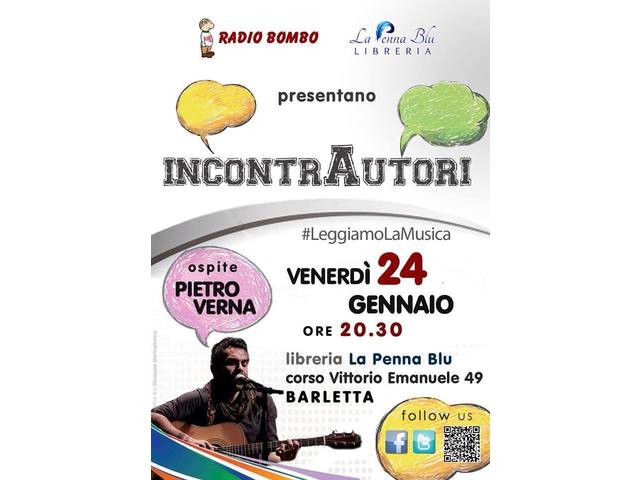 Secondo appuntamento con IncontrAutori, la rassegna dedicata agli autori musicali emergenti organizzata dalla libreria La Penna Blu di Barletta, in C.so Vittorio Emanuele 49, in diretta radiofonica dalle 20.30 sulla emittente locale Radiobombo, con la conduzione di Peppe Martiradonna, speaker radiofonico e Mariagrazia Marchese della redazione di passalaparola.net. Ospite di questa puntata il cantautore Pietro Verna, accompagnato dal chitarrista Luca Fortugno.