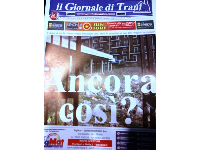 È in edicola il secondo numero de Il Giornale di Trani del 2014: "Ancora così?". Copertina dedicata alla prima inchiesta dell'anno, realizzata da Ottavia Digiaro, sulla struttura presente ormai da 35 anni in via Di Vittorio: quali le prospettive di una delle peggiori incompiute?