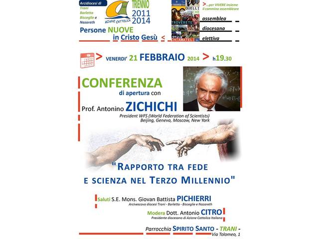 L’Azione Cattolica diocesana, in occasione dell’apertura della IX Assemblea diocesana elettiva, ha invitato il prof. Antonino Zichichi per una conferenza dal tema: “Rapporto tra scienza e fede nel Terzo millennio”.