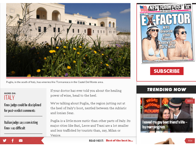 Sulla scia dei tanti articoli apparsi negli ultimi mesi su importanti quotidiani e su prestigiose riviste, si colloca anche un lusinghiero commento che trova spazio in un articolo del New York Post intitolato “Italy’s magical Puglia region” nel quale viene elogiata la Puglia (definita una terra magica) e Trani viene citata tra le città più rappresentative della Regione insieme a Bari e Lecce.