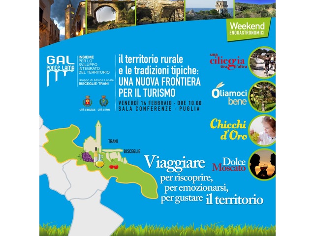 All’evento parteciperanno Antonio Piazzolla, presidente del GAL Ponte Lama e Gianni Porcelli, direttore tecnico del GAL Ponte Lama che relazioneranno insieme al sindaco di Bisceglie Francesco Spina e il sindaco di Trani Luigi Riserbato al convegno sul tema “Il territorio rurale e le produzioni tipiche: una nuova frontiera per il turismo”che si terrà venerdì 14 febbraio alle ore 10.00 nell’area conferenze della Regione Puglia.