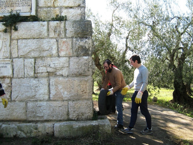 IL monumento è stato per quanto possibile liberato dalle erbe infestanti, questa volta faceva bella mostra uno pneumatico abbandonato che abbiamo voluto riutilizzare in maniera ironica prima di portarlo all’isola ecologica.