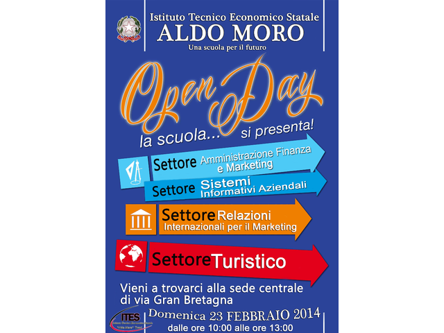 Oggi, domenica 23 febbraio, dalle 10 alle 13, si svolgerà l'«Open day» all’Istituto Tecnico Economico Statale “Aldo Moro” di Trani. Obiettivo, illustrare i percorsi formativi della scuola al fine di aiutare i ragazzi e le rispettive famiglie a scegliere la strada più idonea alle proprie potenzialità.
