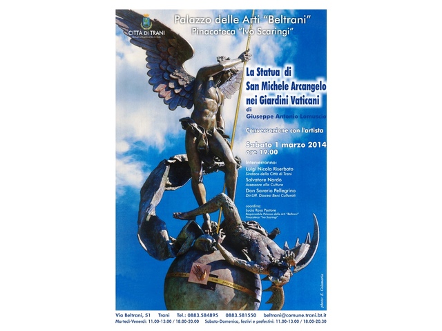 Oggi, sabato 1mo marzo, a Palazzo Beltrani, alle 19, si svolgerà un incontro con l'artista Giuseppe Antonio Lomuscio, in merito alla statua da lui realizzata di san Michele Arcangelo, presente nei giardini vaticani ed inaugurata il 5 luglio scorso alla presenza di Papa Francesco e Papa Ratzinger.