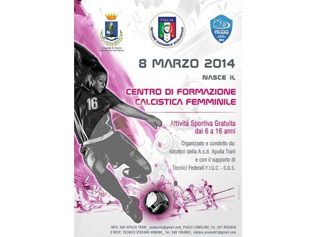 Domani, sabato 8 marzo, nel giorno della festa della donna, all’interno dello stadio Comunale di Trani, alle ore 9.30, verrà inaugurato e presentato alla stampa il centro tecnico di formazione calcistica femminile. Interverranno rappresentanti dell'amministrazione comunale, il presidente del comitato regionale pugliese della Lega nazionale dilettanti, Vito Tisci, il coordinatore federale regionale, Antonio Quarto, i dirigenti scolastici degli Istituti che hanno aderito al progetto, il coordinatore regionale dell’ufficio scolastico di educazione fisica, Marino Pellico.