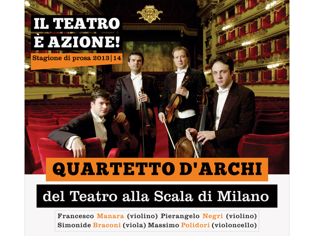 Per la sezione concertistica della Stagione di prosa 2013/2014, organizzata dal Comune di Trani in collaborazione con Teatro pubblico pugliese e circolo di Trani dell’Acli, domani, giovedì 13 marzo (porta ore 20.30, sipario ore 21) presso il teatro Impero, il «Quartetto d’archi del Teatro alla Scala di Milano» si esibirà nell’unica tappa pugliese del 2014. I biglietti sono in vendita sia presso il botteghino dell’Impero, sia presso il circolo Acli, in via De Nicola 32. I prezzi per rispettivi settori, sono 20, 15 e 10 euro. Info: 0883.583444; www.aclitrani.it.
