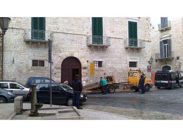Multe e carro attrezzi a volontà, questa mattina, tra piazza Sedile San Marco e via Arcangelo Prologo, per l'inizio degli annunciati lavori di riparazione e sostituzione del basolato di quest'ultima strada, dall'intersezione con la stessa piazza fino a piazza Cesare Battisti.