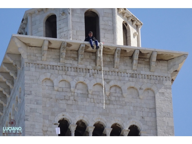Un uomo è rimasto per tre ore sulla sommità del campanile della cattedrale, aggrappato ad una corda a sua volta legata alla cuspide, minacciando di farsi cadere nel vuoto. Lanciava volantini e parlava con qualcuno che era dentro. Su uno dei fogli avrebbe scritto di voler parlare con il sindaco. Con lui ha conferito per primo Padre Nicola Napolitano, rettore della cattedrale. Sul posto gli agenti del Commissariato, i carabinieri, gli operatori della Polizia locale, vigili del fuoco e mezzi di soccorso.