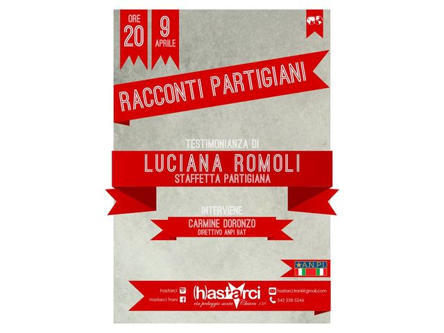 Oggi, mercoledì 9 aprile, alle ore 20.00, presso il Circolo (H)astarci di Trani (via Pedaggio Santa Chiara, 138) si terrà un evento imperdibile: Luciana Romoli, classe 1930, partigiana romana, staffetta della Resistenza, antifascista viscerale, racconterà l’esperienza personale di chi, ad otto anni si è ribellata contro le Leggi Razziali del 1938 e contro chi applicò quella ignominia .