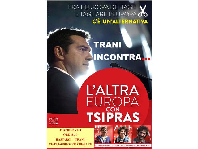 Il Comitato che a Trani sostiene la lista “L’altra Europa per Tsipras” alle elezioni europee che si terranno a maggio, invita la cittadinanza a partecipare ad un pubblico incontro che avrà luogo giovedì 24 aprile alle ore 18.30 presso la sede del Circolo HASTARCI in via Pedaggio Santa Chiara n. 138, a cui parteciperanno tre candidati della lista: Eleonora FORENZA, Teresa MASCIOPINTO e Claudio RICCIO.