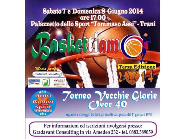 Si sono aperte le iscrizioni per il terzo Torneo Over 40 di Pallacanestro “Baskettiamo” che avrà luogo a Trani presso il Palazzetto dello Sport “Tommaso Assi” nei pomeriggi di sabato 7 e domenica 8 giugno. Organizzato dalla A.S.D. Amici del Basket e dello Sport, in collaborazione con l’Assessorato allo Sport della Città di Trani e con la Gradavant Consulting, azienda tranese anima di tanti eventi sportivi della nostra Città negli ultimi 14 anni, il Torneo si propone come punto d’incontro di tutti gli amanti del basket di una certa età per un doppio pomeriggio di sano divertimento.