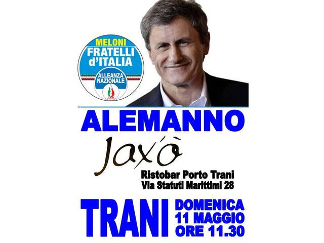 Oggi, domenica 11 maggio, il consigliere comunale di Fratelli dì'Italia-Alleanza nazionale, Raimondo Lima, accompagnerà Gianni Alemanno, sindaco uscente di Roma e candidato al Parlamento europeo, nei comuni del nord barese. A Trani, l’appuntamento è alle 11.30, presso il «Jax'ò» (via Statuti Marittimi, zona porto) per un pubblico incontro.
