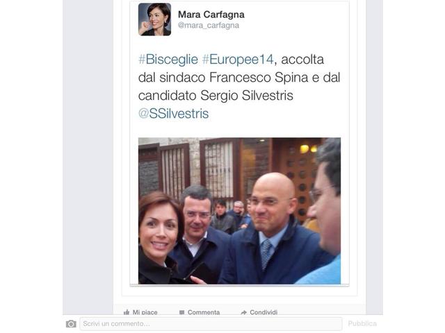 La foto è stata scattata in quel di Bisceglie in occasione della campagna elettorale per le #Europee14 del prossimo 25 maggio. L’On. Mara Carfagna, portavoce di Forza Italia alla Camera, ha tenuto una manifestazione a sostegno dell’europarlamentare Sergio Silvestris e con loro era presente anche il sindaco Gigi Riserbato, di Trani.