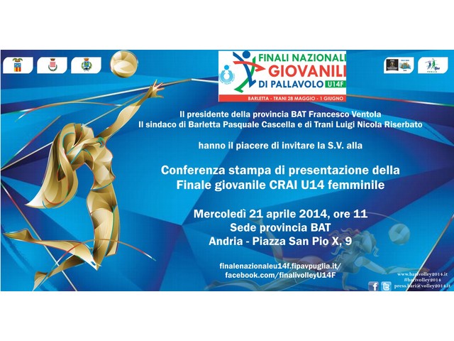 Sarà presentata oggi, mercoledì 21 maggio 2014, presso la sede della provincia BAT (Andria - Piazza San Pio X, 9), la "finale giovanile CRAI U14F" per l'assegnazione dello scudetto U14 di volley femminile, che si svolgerà dal 28 maggio al 1 giugno nei comuni di Trani e Barletta. La conferenza stampa avrà inizio alle ore 11.