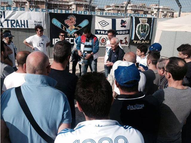 Breve, ma intenso momento di omaggio, ieri pomeriggio, all'esterno dello stadio, per il cinquantenario della storica promozione in serie B della Polisportiva Trani. u iniziativa del «Trani ‘29», le tifoserie organizzate si sono incontrate per un piccolo momento di festa e condivisione. Affissi vessilli e striscioni, accompagnati da un omaggio floreale dedicato ai protagonisti di quell’impresa che tanto lustro diede alla città.