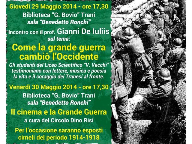 Quest’oggi si è tenuto il primo dei due appuntamenti previsti, chiamato «Come la Grande guerra cambiò l’occidente», in occasione del centenario della prima guerra mondiale. L’evento si è tenuto presso la biblioteca comunale “Giovanni Bovio” nella sala “Benedetto Ronchi”. Le due giornate sono state promosse dal circolo “Dino Risi”, dall’associazione culturale “Trani Nostra” e dall’amministrazione comunale.