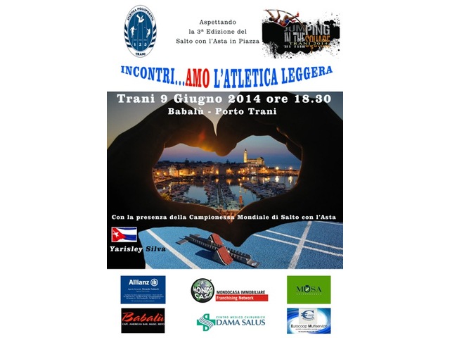 Lunedì 9 giugno alle ore 18.30, presso il Babalù – Porto Trani, l’ACSI Atletica Polisportiva Trani nell’ambito dei preparativi all’evento internazionale estivo del Salto con l’Asta in piazza – Jumping in the Square 2014, organizza una conferenza che avrà il tema: “INCONTRI…AMO L’ATLETICA LEGGERA”.