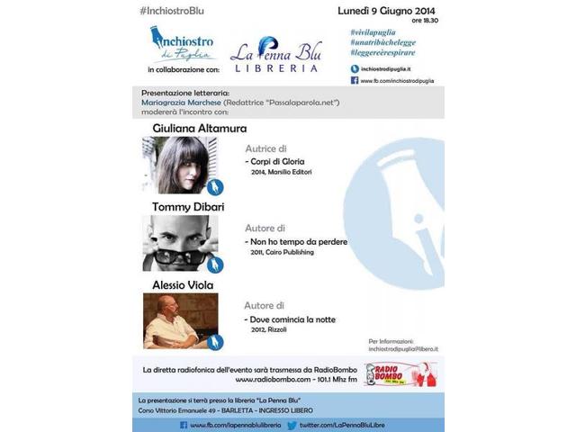 Il tour di Inchiostro di Puglia, nato da un'idea del giovane Michele Galgano, farà tappa a Barletta presso La Penna Blu Libreria e l'incontro sarà trasmesso in diretta su RadioBombo.