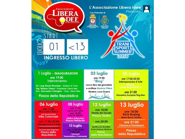 Fino al 13 luglio, in piazza della Repubblica, avrà luogo l’evento estivo tranese «Trani sport summer 2014», a cura dell’associazione Libera idee. Obiettivo «divertirsi e far divertire chi vorrà partecipare». Tra le altre discipline, tiro con l’arco e kick boxing.. Durante il corso dei vari eventi si raccoglieranno le firme «pro San Domenico» per «I luoghi del Fai.