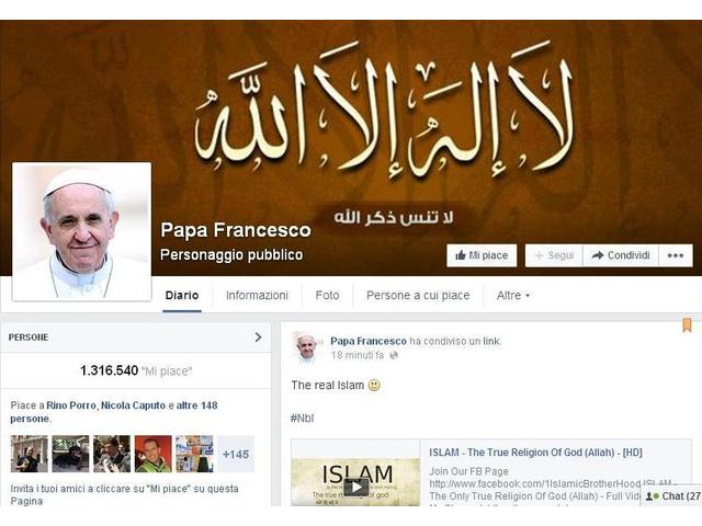 La pagina Facebook di Papa Francesco è stata vittima di un attacco informatico da parte di hacker. La stessa, adesso, presenta l’immagine del Santo Padre come foto di profilo, ma una scritta inneggiante all’Islam come sfondo di copertina. Anche fra i post, compaiono stati introdotti forzatamente, con allegati contenuti di vario tipo fra testi, foto e video, tutti di chiara matrice Islamica.