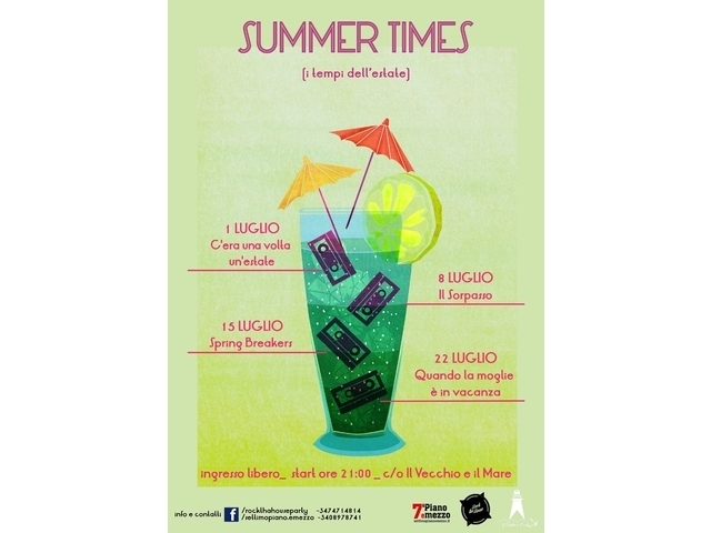 «Settimo piano e mezzo» e «Rock tha house» organizzano «Summer times», una rassegna cinematografica che, attraverso quattro pellicole, cercherà di scandire i tempi di una stagione, l'estate, che oggi come ieri è sinonimo di spensieratezza, crescita, nuove esperienze ed eccesso. A partire da oggi, martedì 1mo luglio, «Il vecchio e il mare», in via Tiepolo nell’area sottostante il fortino della villa comunale si trasformerà in un cinema all’aperto offrendo al pubbico una ricetta tanto semplice quanto efficace: una bibita fresca, il piacere di un film visto a pochi passi dal mare e sotto un tetto di stelle. Si prosegue martedì prossimo, 15 luglio, alle 21, con «Spring breakers» (2013, regia di Harmony Korine). Ingresso libero.