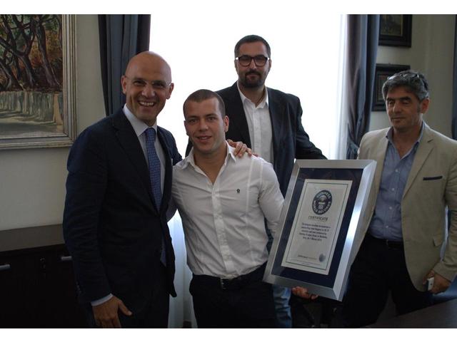 Questa mattina, presso la sala giunta del Comune di Trani, l’atleta tranese Stefano Scarpa ha condiviso con il sindaco di Trani Luigi Riserbato la gioia per l’attestazione ufficiale dell’ingresso nella grande famiglia del Guinness world records. Con Riserbato c'erano anche gli assessori Pasquale Annacondia e Marco Capurso.