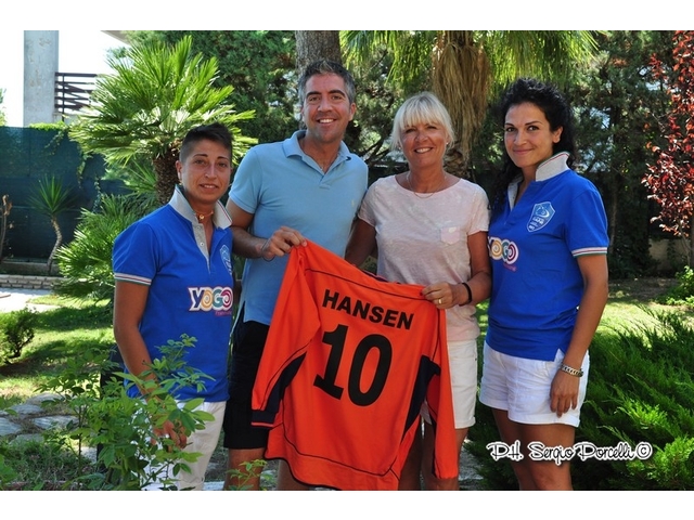 L’incontro con il presidente degli scudetti, Paolo Loporchio e con molti dei dirigenti di quel Trani, a cominciare dall’amico di famiglia Nino Losito, attuale presidente del Comitato Provinciale FIGC. Con loro, dinanzi ad un bel piatto della cucina pugliese,si è parlato di calcio, di ricordi (su tutti, la gara della Nazionale danese giocata contro la Despar Trani, il goal alla Lazio con una punizione pennellata a perfezione, immortalata da Paolo Valenti nella trasmissione 90° minuto, il rigore procurato in piena zona Cesarini, nella gara contro il Friulvini Pordenone che dette alle pugliesi lo Scudetto, la doppietta contro il Verona dinanzi a 12.000 spettatori al Comunale di Trani) ma anche di nuove collaborazioni. Lone Hansen, il calcio non lo ha mai lasciato. In Danimarca è ancora oggi un idolo e quando si parla di lei, inevitabilmente,anche i giornali danesi rispolverano le foto di quel Trani che la vide tra le sue fila con le connazionali Ulla Baustrup e Susi Augustensen.