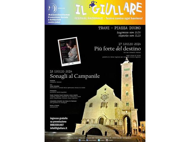 Questa sera in piazza uomo, alle 21, nell’ambito degli eventi de «Il giullare», a cura dell’associazione Promozione sociale e solidarietà, “Sonagli al Campanile”, serata di danza, musica e poesia presentata da Antonella Ferrari e con: Tarek Drago e Sara Greotti, campioni italiani di Wheel chair dance; Le Faraualla; Erica Brindisi, ballerina, autrice dello spettacolo “Smania di vivere”; Marco e Chicco; Antonietta Siletti e Tomas di Terlizzi. Ingresso libero con prenotazione allo 0883.501407.