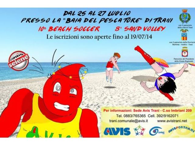 Fino ad oggi, domenica 27 luglio, l’Avis Trani organizza la 10ma edizione del Beach soccer e l’8va del Sand volley presso la baia del pescatore, in collaborazione con Radio Selene. Con l'occasione, sempre oggi, domenica 27 luglio, in piazza Marinai d'Italia, dalle 17 alle 21, si terrà una raccolta straordinaria di sangue in autoemoteca.