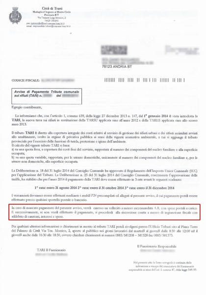 Per puntualizzare alcuni elementi di valutazione oggettiva è stato il Presidente di Unimpresa Bat, Savino Montaruli, ad intervenire sull’argomento e, rivolgendosi agli imprenditori ha detto: “È vero, avete ragione, non esiste alcuna necessità di farsi prendere dalla fretta e dall’ansia di pagare alle scadenze previste ed indicate nell’avviso di pagamento anche perché tali scadenze sono solo ordinatorie e non perentorie quindi non rispettarle il 31 agosto, il 31 ottobre e il 31 dicembre 2014 non comporta alcuna sanzione perché se notate bene sugli stessi avvisi di pagamento che in queste ore vi stanno pervenendo è scritto a chiare lettere che - in caso di mancato pagamento del presente avviso, verrà emesso un sollecito a mezzo raccomandata A.R. con spese postali a carico e successivamente, se non verrà effettuato il pagamento, si procederà alla riscossione coatta a mezzo di ingiunzione fiscale con addebito di sanzioni, interessi e spese -. Si tenga conto – ha detto Montaruli – che nella città di Andria sono trascorsi moltissimi mesi ed oltre un anno dalla scadenza di quanto dovuto per la Tares 2013 e ad oggi ancora tali raccomandate di sollecito non sono pervenute a chi non ha pagato quindi questo significa che abbiamo tutto il tempo necessario per le verifiche dei singoli casi e anche per attenderci un’opportuna revisione del Regolamento e delle Tariffe il quale sicuramente andrebbe meglio articolato e strutturato, esattamente come già richiesto anche dagli amici di C.N.A. Trani. Sappiate però – ha detto Montaruli – che decidere di intraprendere azioni di protesta civile come quella, legittima e prevista, di non pagare immediatamente alle scadenze e di attendere l’arrivo delle raccomandate senza costi aggiuntivi se non quello della spedizione, può significare far venire meno nelle casse comunali, di Trani e di tutti quei comuni ove si attuerebbe, enormi risorse finanziarie con il rischio di un blocco totale dei capitoli di uscita e delle spese fino al collasso totale e al dissesto in quanto gli introiti previsti dalla TARI sono di notevole entità e facendo venir meno la loro riscossione nel bilancio corrente è cosa che comporta conseguenze di non poco conto con risvolti negativi anche per i cittadini quindi andiamo cauti. E’ per questo – ha detto il Presidente di Unimpresa Bat – che noi non ci sottrarremmo ai pagamenti ma riteniamo che si debba pagare il giusto mentre per taluni Settori e Categorie, invece, tali aumenti sproporzionati sono inconcepibili e vanno assolutamente rivisti tenendo anche conto delle indicazioni ministeriali che in effetti stanno mettendo in difficoltà anche i comuni e le amministrazioni locali sempre più soggetti passivi e soccombenti», ha concluso Montaruli.