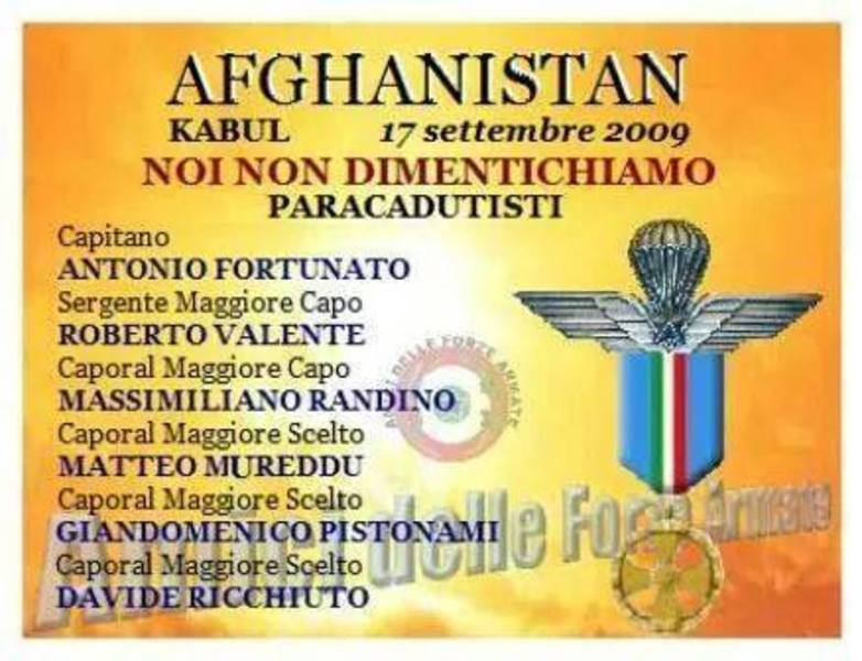 Oggi, domenica 21 settembre, alle 11 presso la villa comunale, i paracadutisti di Trani, come ogni anno in questa data, onoreranno la memoria dei sei parà della Folgore vittime della strage di Kabul della 18 settembre 2009.