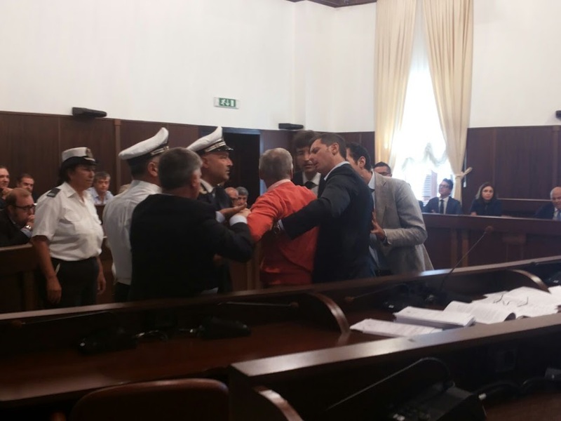 Alla lettura di tale provvedimento, fatta in aula in apertura di seduta dal capogruppo di Ncd ed Udc, Giuseppe Tortosa, il sindaco, fuori microfono, ha risposto piccato pungendo, probabilmente sul piano personale, sia il portavoce del documento, sia l'altro consigliere comunale d’opposizione che era rimasto in aula solo per ascoltare quella dichiarazione, Francesco Laurora, dei Verdi: ne è nato un violento battibecco, che ha visto il secondo, avvicinarsi allo scranno di Riserbato e sfidarlo faccia a faccia, a muso duro.