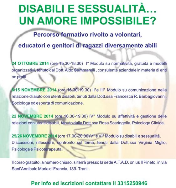 Il prossimo 24 ottobre presso la sede dell'associazione A.T.A.D Il Pineto, ubicata in via Sant'Annibale Maria di Francia a Trani, parte un corso di formazione, finanziato dal csvBari, dal titolo "Disabili e sessualità... Un amore impossibile?".