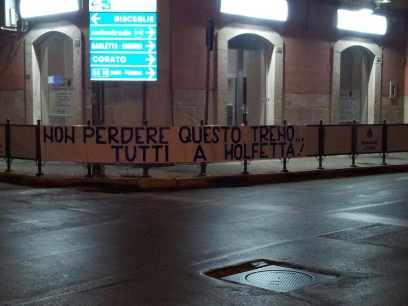 Leggiamo con piacere le parole dell'assessore allo sport Paco Annacondia, anche al quale, come tifoso, è stata negata la libertà di tifare Trani. Giacché era in stazione, gli chiediamo di difendere i diritti, in qualità di rappresentante pubblico, delle centinaia di tifosi ai quali, non si sa per quale motivo, è stato negato di essere a Molfetta in una giornata che doveva essere puramente dedicata allo sport.