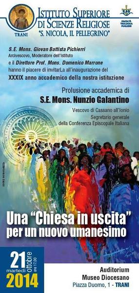 Oggi, martedì 21 ottobre, alle 17, presso il l'auditorium del Museo diocesano, l'Istituto superiore di scienze religiose "San Nicola, il Pellegrino" inaugurerà il 39mo anno accademico con una prolusione tenuta da Mons. Nunzio Galantino, segretario generale della Conferenza episcopale italiana. Saranno presenti l’arcivescovo, Mons. Giovan Battista Pichierri, ed il direttore dell’Issr, Mons. Prof. Domenico Marrone.