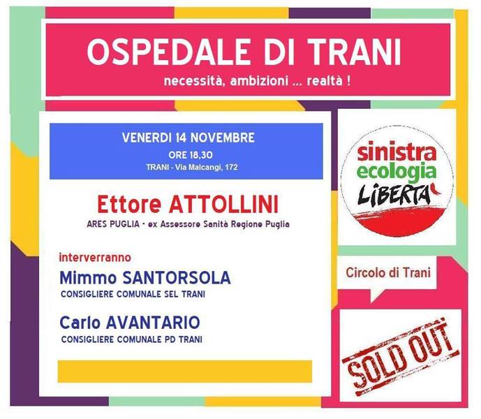 La verità sull'ospedale di Trani e sulla sanità in Puglia secondo Sinistra ecologia e libertà. Se ne parlerà oggi, venerdì 14 novembre, alle 18.30, presso la sede di Trani del partito di Vendola, in via Malcangi 172, alla presenza dell'ex assessore regionale alla sanità, Ettore Attollini, e dei consiglieri comunali Mimmo Santorsola, di Sel, e Carlo Avantario, del Partito democratico.