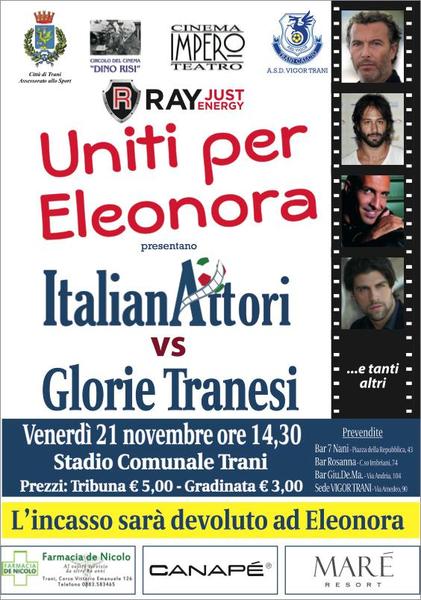 La società biancazzurra della Vigor Trani si è impegnata nell'organizzare una partita tra la Nazionale italiana Attori e Vecchie Glorie Tranesi, devolvendo poi l'incasso ricavato alla causa di Eleonora che dovrà affrontare una spesa di circa 50mila euro per l'operazione che non risolverà del tutto i suoi problemi ma le permetterà molto probabilmente di migliorare la sua condizione di vita.