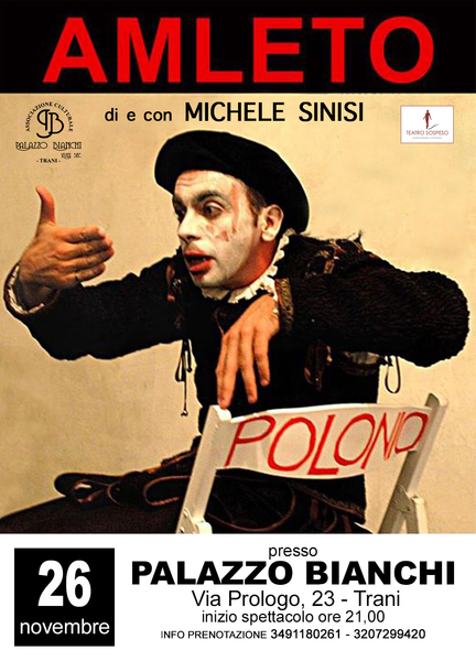 L’attore e regista teatrale Michele Sinisi domani, mercoledì 26 novembre, sarà ospite del terzo appuntamento della sezione teatro, con lo spettacolo “Amleto”. Michele Sinisi sarà Amleto che si trova in una stanza e vive in completa solitudine la sua storia. I fatti, i personaggi, sono caduti davanti ai propri occhi e malgrado il suo volere e i suoi desideri deve confrontarsi con questi e prendere delle decisioni. La tragedia sta nel fatto che deve comunque risolvere la sua storia da solo, deve stare lì a parlare con personaggi assenti. Polonio, Re Claudio, Ofelia, Laerte, la madre Gertrude, l’attore della compagnia girovaga, non ci sono o forse non sono arrivati.