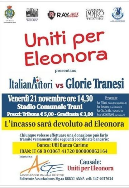 Lo scorso 21 novembre la nostra società si è impegnata nell'organizzare una partita tra la Nazionale italiana Attori e Vecchie Glorie Tranesi, devolvendo poi l'incasso ricavato alla causa di Eleonora (cittadina tranese affetta da una grave malattia) che dovrà affrontare una spesa di circa 50mila euro per l'operazione che non risolverà del tutto i suoi problemi ma le permetterà molto probabilmente di migliorare la sua condizione di vita.