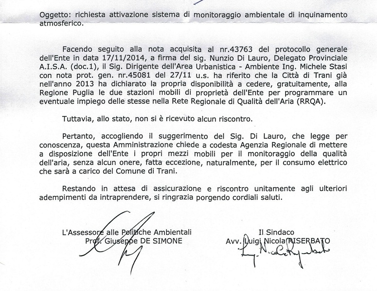 A seguito della segnalazione che l’A.I.S.A. (Associazione Italiana Sicurezza Ambientale) – Delegazione Provinciale BAT in Trani – ha rivolto al Signor Sindaco di Trani in data 17 novembre 2014 avente per oggetto: “Richiesta attivazione sistema di monitoraggio ambientale di inquinamento atmosferico”, il Sindaco Luigi Nicola Riserbato ha immediatamente trasmesso la nota all’Assessore all’Ambiente, Al Dirigente Area Ambiente e al Cap. della Polizia Locale Settore Ambiente invitandoli “a dare urgente riscontro al Delegato provinciale A.I.S.A. Nunzio Di Lauro in merito a quanto richiesto”.