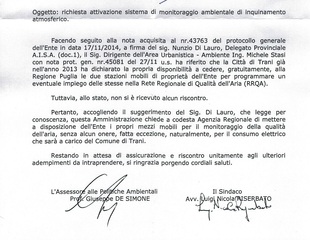 Successivamente, in data 10 dicembre 2014, in una nota a firma del Sindaco Riserbato e dell’Assessore all’Ambiente De Simone, l’Amministrazione comunale chiede ufficialmente all’ARPA Puglia “di mettere a disposizione dell’Ente i propri mezzi mobili per il monitoraggio della qualità dell’aria, senza alcun onere, fatta eccezione, naturalmente, per il consumo elettrico che sarà a carico del Comune di Trani”.