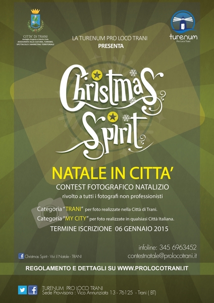 “Dopo il bando per il concorso riguardante esercenti e comitati di quartiere, abbiamo dato il via ufficialmente al contest fotografico Christmas Spirit - NATALE IN CITTA' – dichiara il presidente della pro loco, Angelo Avveniente, che continua - L'obiettivo del concorso è quello di raccogliere le immagini fotografiche più rappresentative delle festività natalizie nella città di Trani ed in tutto il territorio italiano, nonché di premiare le più pregevoli da un punto di vista artistico, storico e folkloristico.