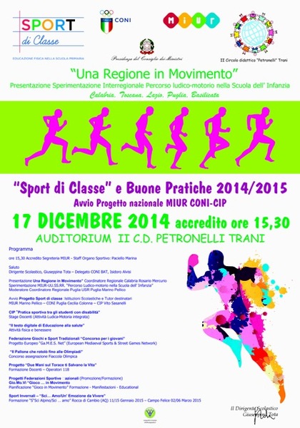 Trani e la scuola elementare Petronelli ospiteranno oggi, mercoledì 17 dicembre, presso l'auditorium di via Petronelli, con inizio alle 15.30, docenti delle regioni Puglia, Calabria, Toscana, Lazio e Basilicata che si confronteranno con tecnici del Miur e del Coni sul tema "Sport di classe e buone pratiche. Una regione in movimento".