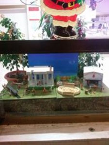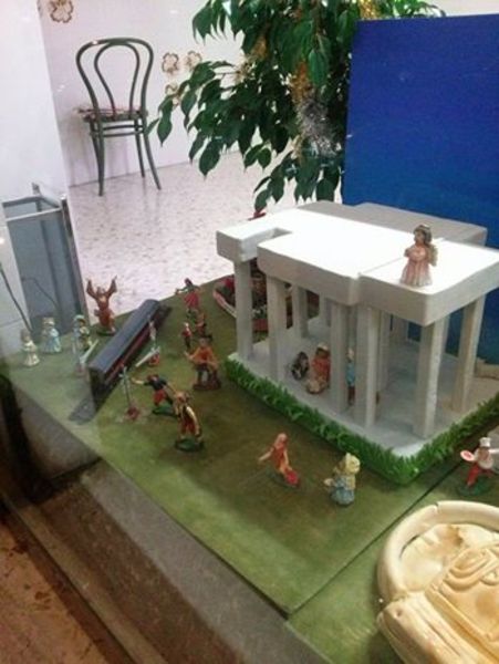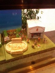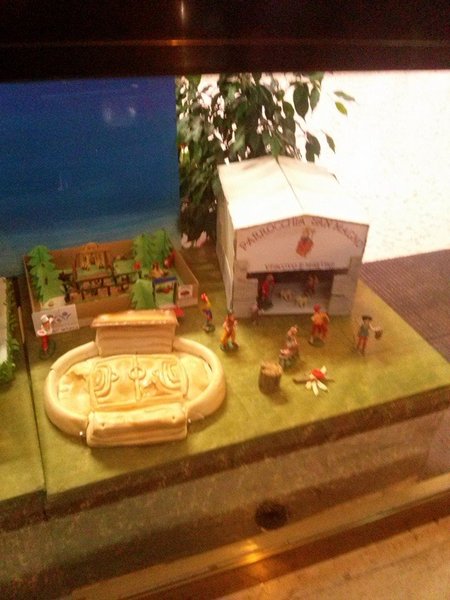 Proseguendo verso il lato destro dell’opera riconosciamo lo stadio comunale di Trani, riprodotto in pasta di pane; la ludoteca e la tensostruttura della Parrocchia San Magno.