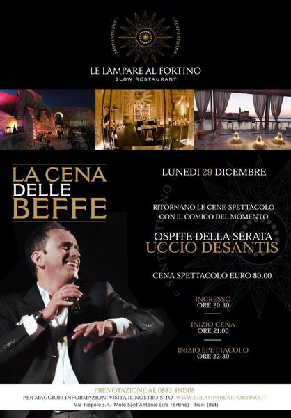 Si rinnova l’appuntamento esilarante con “La Cena delle Beffe” presso il slow restaurant Le Lampare al Fortino di Trani. Dopo aver avuto ospiti importanti sul nostro palcoscenico come Gianni Ciardo, Maurizio Micheli, Carmela Vincenti, Nado Varriale dalla trasmissione televisiva Zelig Off, i comici del programma televisivo Made in Sud e la compagnia Anonima Gr, quest’anno non poteva mancare il geniale e frizzante comico di origini pugliesi Uccio De Santis.