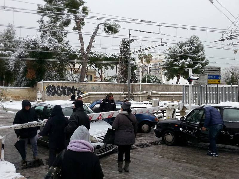 Non è dovuto intervenire il 118, né tanto meno persone si sono recate al pronto soccorso per contusioni o, peggio ancora, fratture per cadute. Evidentemente, l’intensa precipitazione nevosa su Trani ha indotto tutti alla prudenza, ma la stessa non è mai troppa. Infatti in via Corato, al passaggio a livello, si è registrato il primo incidente con tanto di tragedia sfiorata. Due auto in transito non sono riuscite ad oltrepassare le sbarre prima che queste si chiudessero rimanendo bloccate all'interno del passaggio. Fortunatamente, anche grazie all'aiuto dei volontari, si è evitata la tragedia.