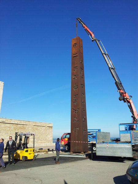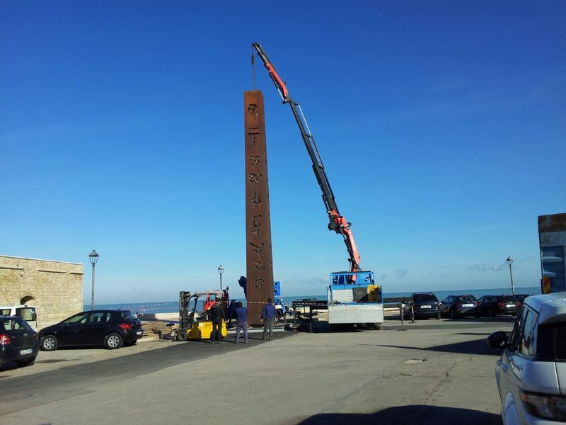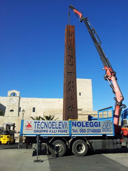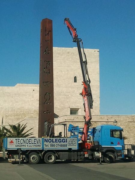 Qualcuno potrebbe anche festeggiare l’evento con un nuovo spettacolo pirotecnico al castello: infatti, oggi, l'obelisco di Arnaldo Pomodoro, insieme con la mostra dell’artista ospitata all'interno delle mura federiciane, lascia Trani. Operai, su autogru, stanno smontando la colonna di richiamo dell’esposizione tenutasi fino alla giornata di ieri nel maniero di Trani, contemporaneamente a quelle dei castelli di Andria e Bari.