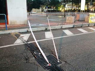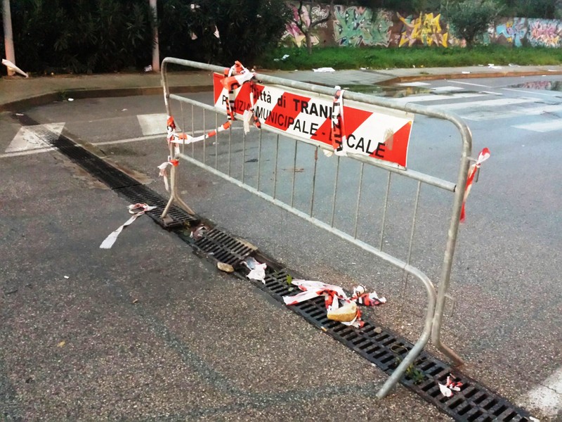 Una doppia messa in sicurezza sulla stessa fila di grate a protezione, ormai sempre più relativa, di uno dei canali di scolo delle acque meteoriche nei pressi del sottovia di via Pozzo piano. E, così, transenne e nastro di segnalazione diventano essi stessi un pericolo, perché, ormai, lo spazio per il transito dei veicoli si è ristretto in maniera fin troppo evidente.