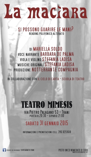 Dopo l’anteprima nazionale al Piccolo Teatro di Bari e un mini tour in Basilicata, “La macìara. Si possono guarire le mani?” prosegue il suo percorso oggi, sabato 31 gennaio 2015 (porta 20:30 – ingresso 21:00) al Teatro Mimesis di Trani (via Pietro Palagano 53). L’evento è organizzato in collaborazione con il Cielo di Carta – Scuola di Teatro di Trani.