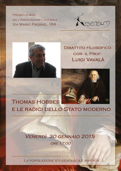 Oggi, vVenerdì 30 Gennaio alle h 17 presso la sede dell'associazione culturale Arsensum situata in Via Mario Pagano, 184 si svolgerà un dibattito filosofico con il Prof. Luigi Vavala', rileggeremo in chiave contemporanea il pensiero politico e filosofico di Thomas Hobbes ripercorrendo le radici dello Stato moderno e poi daremo ampio spazio alla discussione. Thomas Hobbes è stato un filosofo e matematico britannico, autore nel 1651 dell'opera di filosofia politica Leviatano, oltre che della teoria politica si interessò e scrisse di storia, geometria, etica, ed economia. Sarà bello approfondire insieme temi già affrontati sui banchi di scuola in una location sicuramente molto più suggestiva e in maniera interattiva avendo la possibilità di confrontare le proprie impressioni personali sulle opere dell’autore e di favorire un scambio di opinioni in merito finalizzato ad un confronto sano e costruttivo. La popolazione studentesca è invitata.